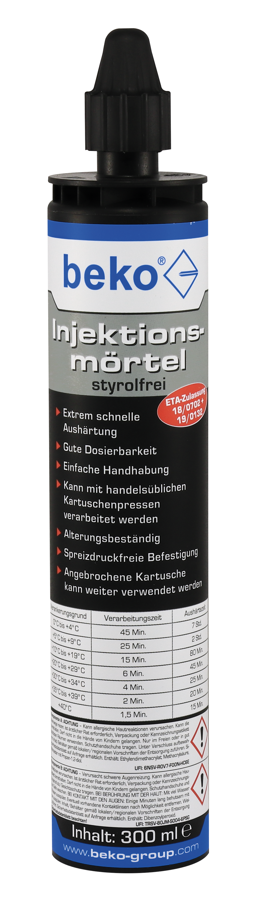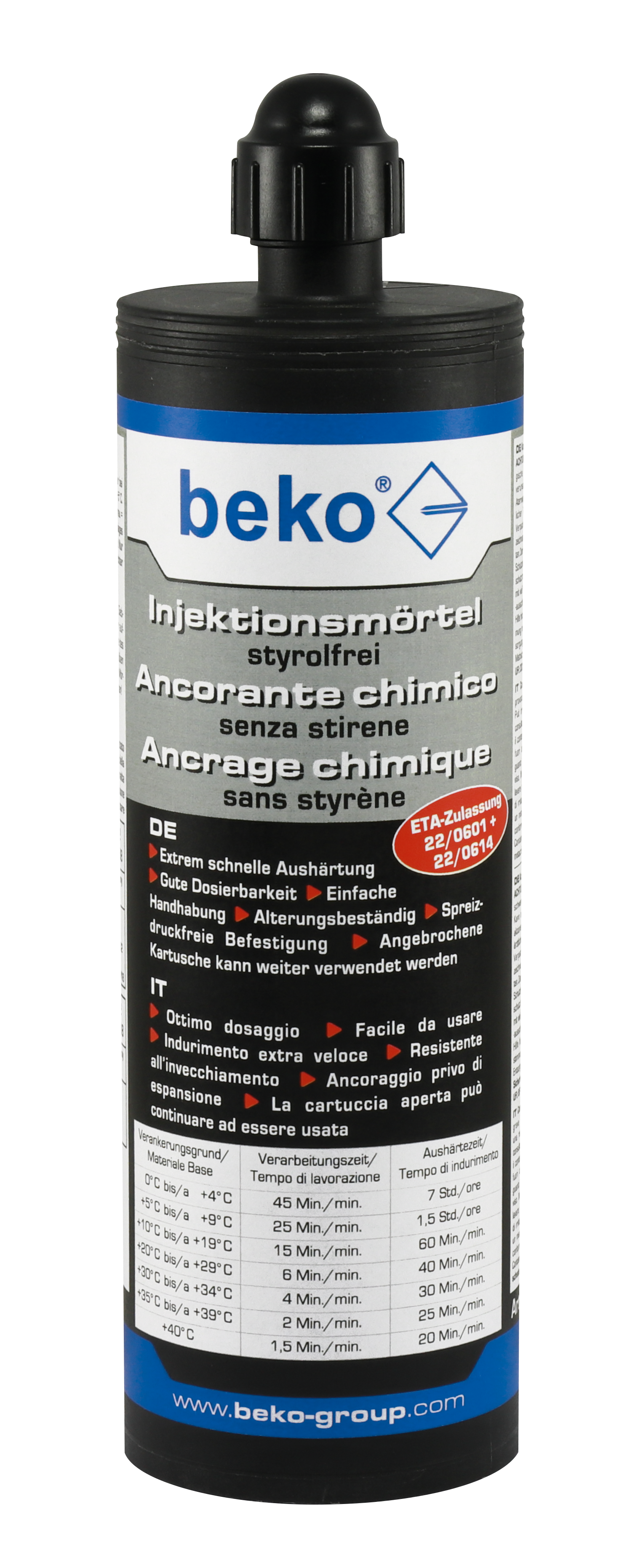 Mit Europäisch Technischer Zulassung (ETA-22/0601 + ETA-22/0614), spreizdruckfreie Befestigung, zweikomponentig, einfache Handhabung - gute Dosierbarkeit, alterungsbeständig, hohe chemische Beständigkeit, temperaturbeständig bis max. +80° C.